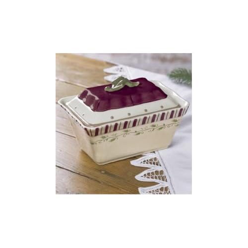 -Country crock refinement. Bake Shop Covered Casserole Dish features a sedate rectangular shape rimmed with a rich burgundy and white candy cane strip with holly detail just below and a gold accented burgundy and white lid with green leaf handle.--Stoneware casserole dish measures 6 11/4in x 4 1/2in x 4 and is dishwasher, oven and microwave safe.--Item# 447272